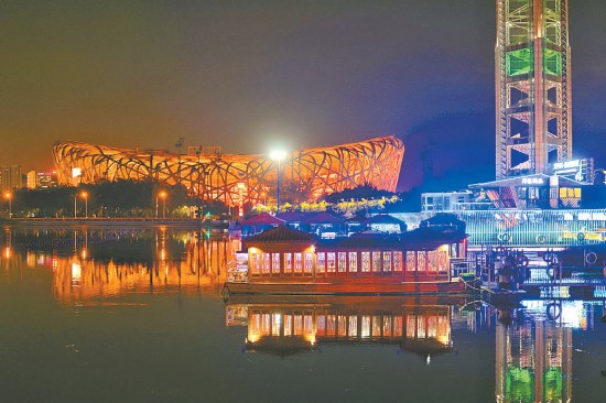 鳥(niǎo)巢北側(cè)的月色碼頭霓虹閃爍,濱水而建的月色碼頭已成為一處公園式消夏廣場(chǎng)。本報(bào)記者 潘之望攝