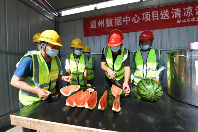 在通州數(shù)據(jù)中心項(xiàng)目頂板鋪設(shè)施工現(xiàn)場(chǎng),高溫對(duì)奮戰(zhàn)在施工一線的員工來(lái)說(shuō)無(wú)疑是一場(chǎng)巨大的“烤驗(yàn)”?!半m然現(xiàn)場(chǎng)的溫度達(dá)到了38℃,但是項(xiàng)目部合理調(diào)配時(shí)間,對(duì)現(xiàn)場(chǎng)的防暑降溫工作做了全面部署,施工現(xiàn)場(chǎng)配備了西瓜、綠豆湯、藿香正氣水和清涼油等防暑物資,在場(chǎng)邊設(shè)置了遮陽(yáng)涼棚,并且讓施工人員避開(kāi)上10點(diǎn)到下午3點(diǎn)的高溫期錯(cuò)時(shí)上崗,保證現(xiàn)場(chǎng)安全生產(chǎn)的同時(shí)也盡量不耽誤項(xiàng)目進(jìn)度?!表?xiàng)目部負(fù)責(zé)人胡永忠說(shuō)。