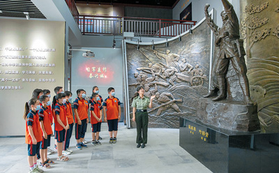 7月6日,在江蘇省泰興市新街鎮(zhèn)楊村廟烈士紀(jì)念館,少先隊(duì)員在宣泰戰(zhàn)斗浮雕前聽講解員講解。顧繼紅攝(影像中國(guó))
