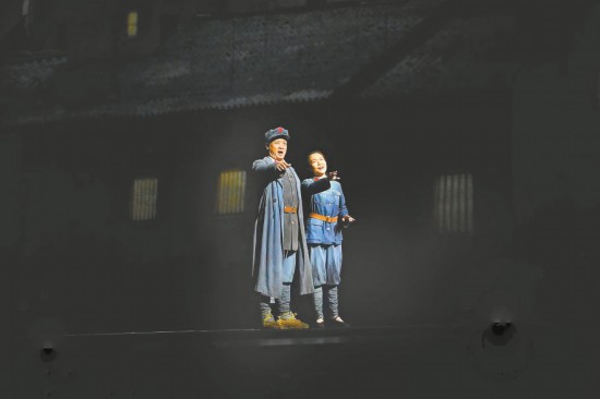 “閻老師可以再往前走幾步,要不然后面的合唱團(tuán)一上來(lái)有點(diǎn)擠?!蔽枧_(tái)監(jiān)督陳歡用激光筆指了一下舞臺(tái)的前側(cè)區(qū)域。歌唱家閻維文點(diǎn)點(diǎn)頭,對(duì)臺(tái)下比了“OK”的手勢(shì)。燈光再次到位,排練繼續(xù),多媒體影像配合著兩側(cè)峭壁般聳立的舞美裝置,讓湘江翻涌的江水和咆哮的戰(zhàn)火穿越歷史,滾滾而來(lái)。