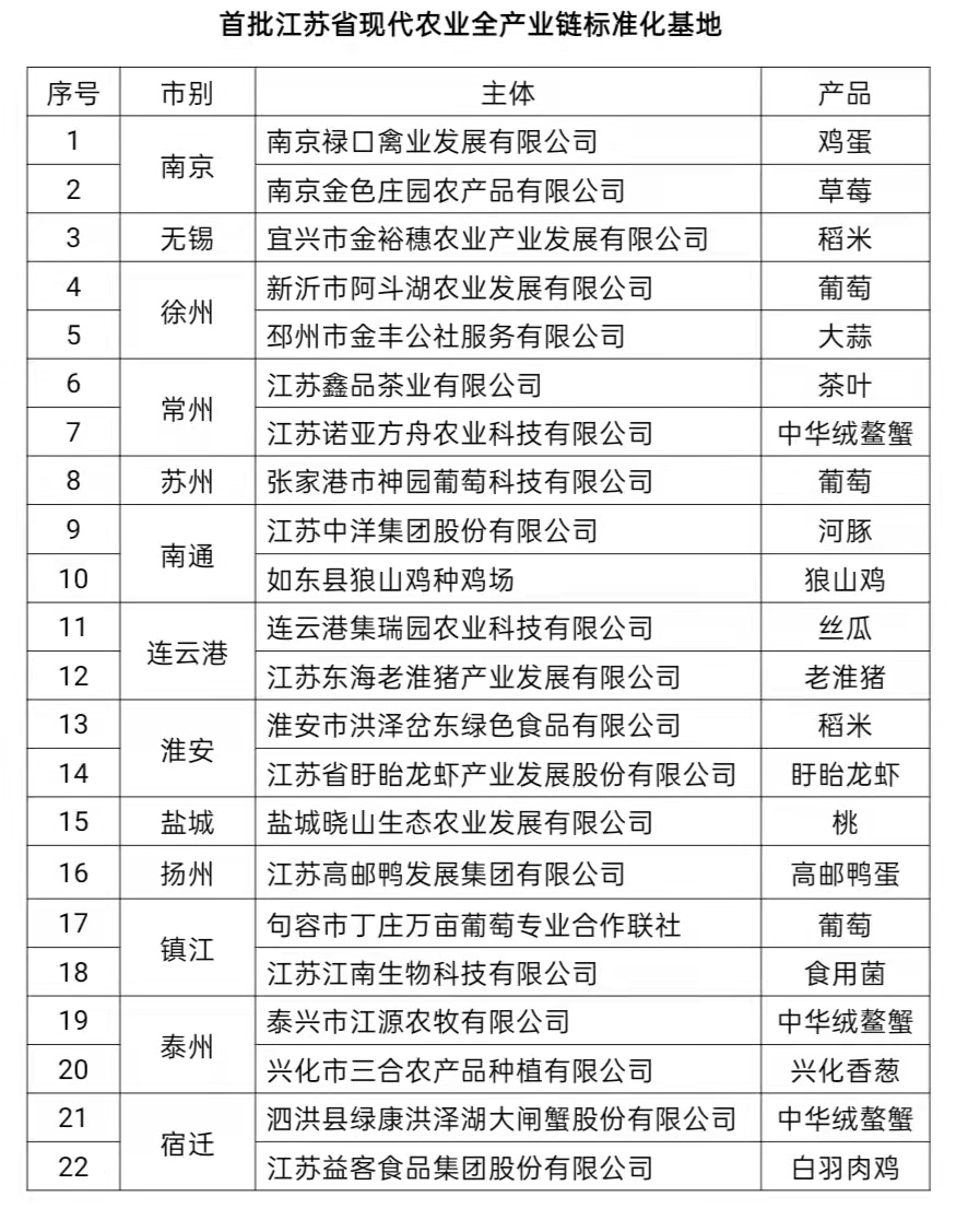 江蘇公布首批22家現(xiàn)代農(nóng)業(yè)全產(chǎn)業(yè)鏈標準化基地