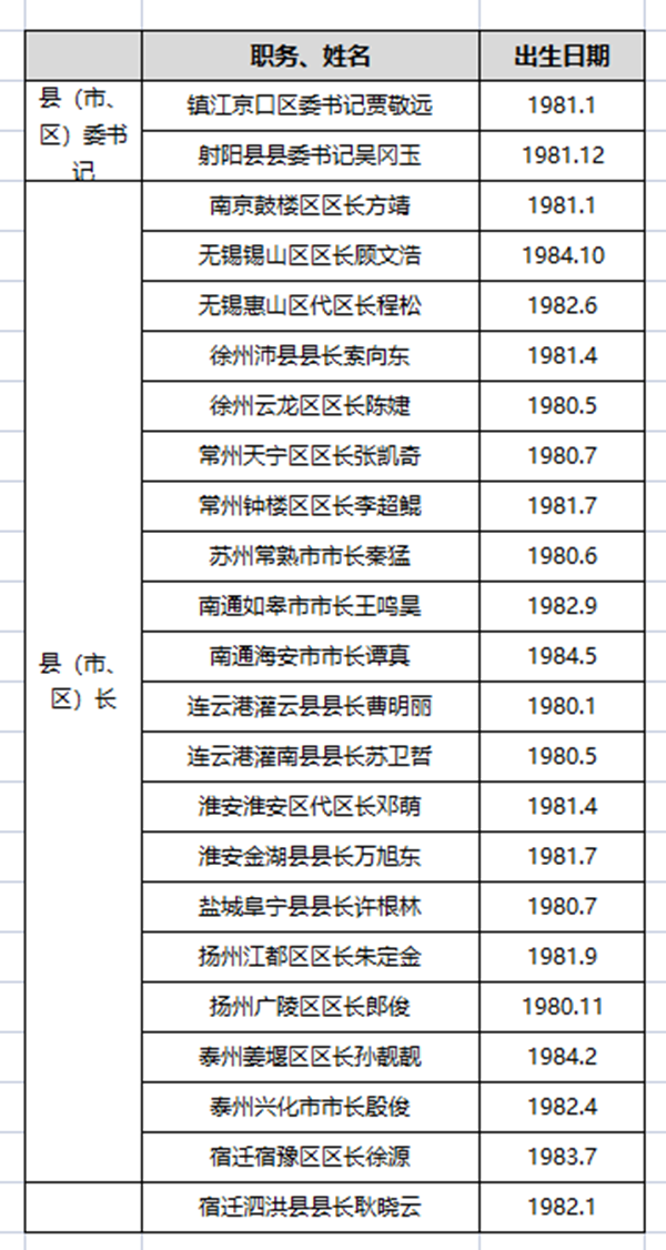 目前,江蘇共有23名“80后”縣(市、區(qū))黨政主官,最年輕的是出生于1984年10月的無(wú)錫錫山區(qū)區(qū)長(zhǎng)顧文浩,最年長(zhǎng)的是連云港灌云縣縣長(zhǎng)曹明麗,出生于1980年1月。23人中,17名男性,6名女性。
