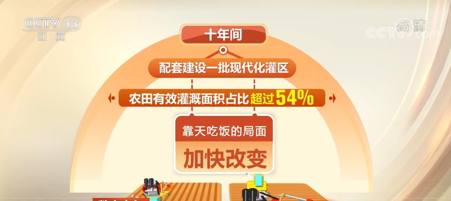 十年間,農(nóng)業(yè)基礎(chǔ)設(shè)施明顯改善,累計(jì)建成9億畝高標(biāo)準(zhǔn)農(nóng)田,配套建設(shè)一批現(xiàn)代化灌區(qū),農(nóng)田有效灌溉面積占比超過(guò)54%,靠天吃飯的局面加快改變。