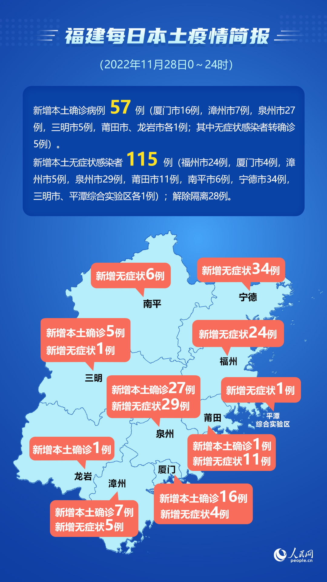 人民網(wǎng)福州11月29日電 (江葦杭、陳永整)據(jù)福建省衛(wèi)健委網(wǎng)站消息,11月28日0-24時(shí),福建省報(bào)告新增本土確診病例新增本土確診病例57例(廈門市16例,漳州市7例,泉州市27例,三明市5例,莆田市、龍巖市各1例;其中無(wú)癥狀感染者轉(zhuǎn)確診5例)。當(dāng)日?qǐng)?bào)告新增本土無(wú)癥狀感染者115例(福州市24例,廈門市4例,漳州市5例,泉州市29例,莆田市11例,南平市6例,寧德市34例,三明市、平潭綜合實(shí)驗(yàn)區(qū)各1例);解除隔離28例。全省本土確診病例目前住院365例,無(wú)死亡病例;現(xiàn)有本土無(wú)癥狀感染者尚在接受集中隔離醫(yī)學(xué)觀察623例。