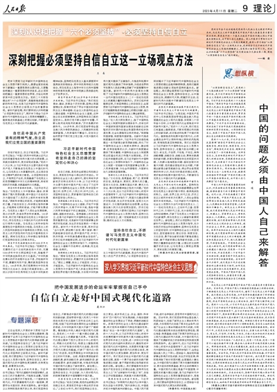 黨的百年奮斗成功道路是黨領導人民獨立自主探索開辟出來的,馬克思主義的中國篇章是中國共產黨人依靠自身力量實踐出來的,貫穿其中的一個基本點就是中國的問題必須從中國基本國情出發(fā),由中國人自己來解答。深入開展學習貫徹習近平新時代中國特色社會主義思想主題教育,要深入學習領會“必須堅持自信自立”這一立場觀點方法,更好領會習近平新時代中國特色社會主義思想的精髓要義,自覺用以指導各項工作。深刻認識和把握“六個必須堅持”系列理論版今天推出第二期,圍繞“必須堅持自信自立”進行闡述。