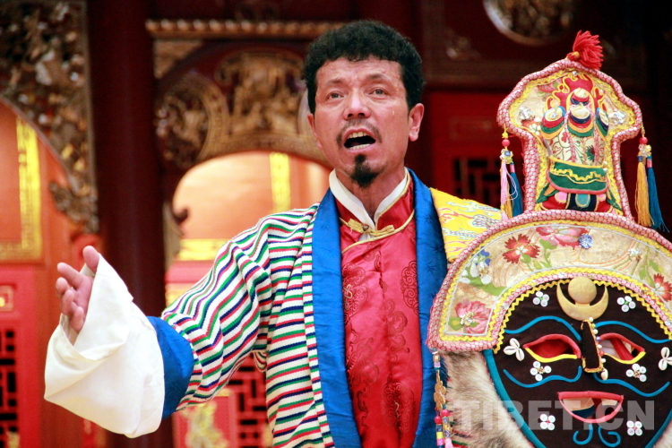 拉薩市城關(guān)區(qū)娘熱民間藝術(shù)團(tuán)成員、西藏自治區(qū)級覺木隆藏戲傳承人洛桑次仁是目前為數(shù)不多的掌握了全部“八大藏戲”唱腔、表演的戲師。圖為洛桑次仁表演藏戲唱腔《朗薩雯波》之貢桑德慶唱腔攝影:劉莉