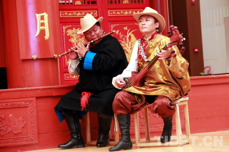 圖為拉薩市城關(guān)區(qū)娘熱民間藝術(shù)團(tuán)樂師米瑪(左)和拉巴次仁(右)為演出伴奏。米瑪是西藏自治區(qū)級嘎爾傳承人,擔(dān)任藝術(shù)團(tuán)笛子演奏、司鼓;拉巴次仁是拉薩市城關(guān)區(qū)級喇嘛瑪尼傳承人,擔(dān)任藝術(shù)團(tuán)扎木年演奏。攝影:劉莉