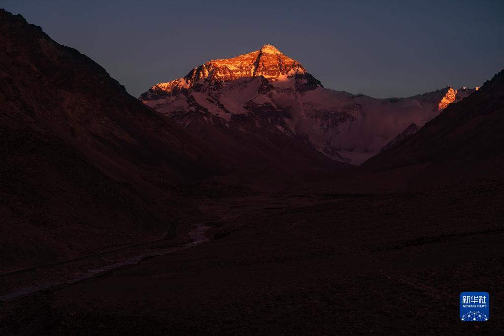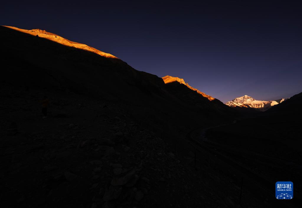 6月4日,最后一抹陽(yáng)光即將從珠峰頂上消逝。新華社記者 費(fèi)茂華 攝