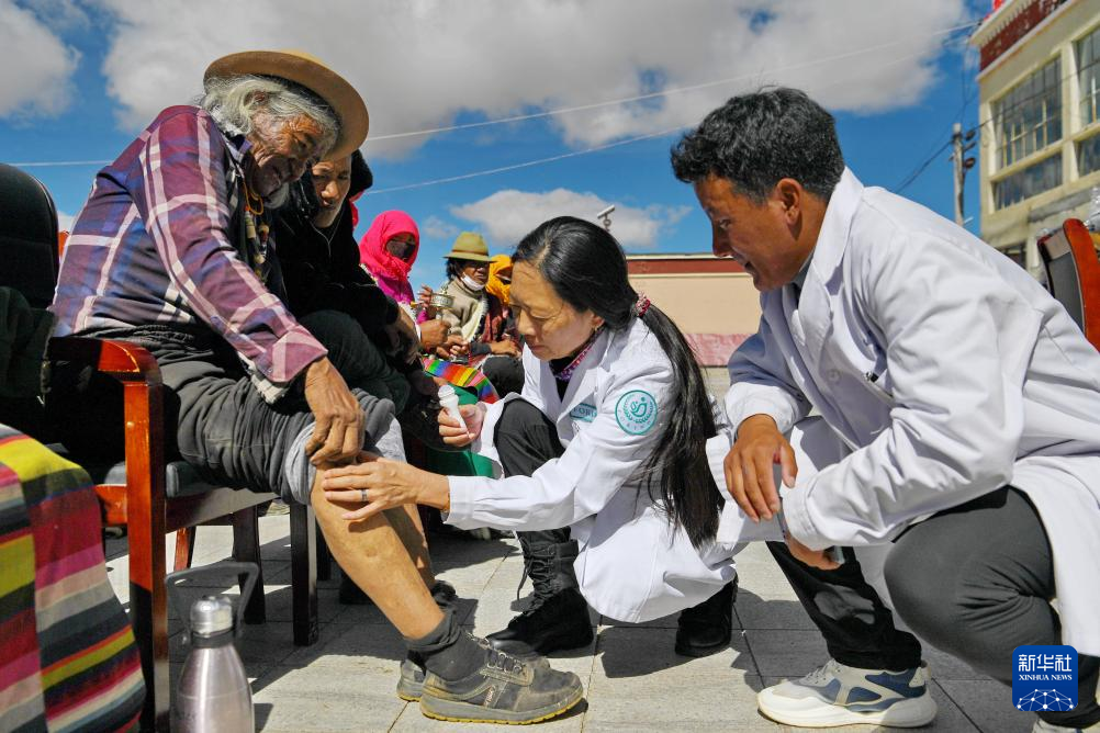 8月18日,在阿里地區(qū)措勤縣曲洛鄉(xiāng),西藏阜康腫瘤醫(yī)院康復(fù)理療師唐穎(右二)為當(dāng)?shù)厝罕娏x診。新華社記者 張汝鋒 攝