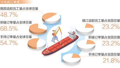 今年前三季度,我國造船完工量、新接訂單量和手持訂單量以載重噸計分別占全球總量的48.7%、68.5%和54.7%,均居世界第一。在江蘇泰州靖江市,當地造船企業(yè)的訂單排到了2026年,成為我國船舶業(yè)轉型升級、穩(wěn)步向好的縮影。