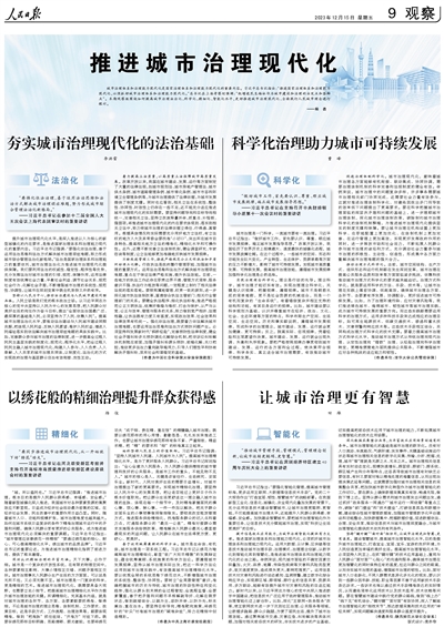 城市治理體系和治理能力現(xiàn)代化是國家治理體系和治理能力現(xiàn)代化的重要內(nèi)容。習(xí)近平總書記指出:“推進(jìn)國家治理體系和治理能力現(xiàn)代化,必須抓好城市治理體系和治理能力現(xiàn)代化?!笨倳浽谏虾?疾鞎r(shí)強(qiáng)調(diào):“把增進(jìn)民生福祉作為城市建設(shè)和治理的出發(fā)點(diǎn)和落腳點(diǎn)”。本期觀察版圍繞如何提高城市治理法治化、科學(xué)化、精細(xì)化、智能化水平,更好推進(jìn)城市治理現(xiàn)代化、全面踐行人民城市理念進(jìn)行探討。