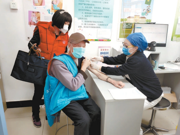 11日,石景山區(qū)古城街道60歲以上人員在社區(qū)工作人員的協(xié)助下接種新冠疫苗。古城街道社區(qū)通過“線上+線下”各種形式廣泛宣傳,持續(xù)推進轄區(qū)60歲以上人員新冠疫苗接種工作。 吳鏑攝