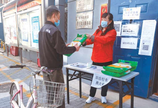 14日,石景山區(qū)古城街道北小區(qū)社區(qū)開展廢舊自行車置換活動,居民用落灰的自行車換到了整袋的大米。 本報記者 吳鏑攝