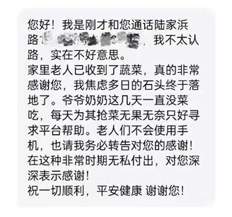 宋志勇的母親是一位使用智能手機不太“靈光”的老人。想到連短信都不會發(fā)的母親,再看到老人家屬代發(fā)的感謝短信,宋志勇覺得自己能成為應急特需保供的一員挺榮幸。