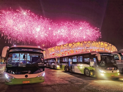 2月4日晚,北京冬奧會開幕式焰火與保障車輛“同框”。本版圖片/北京市交通委員會供圖