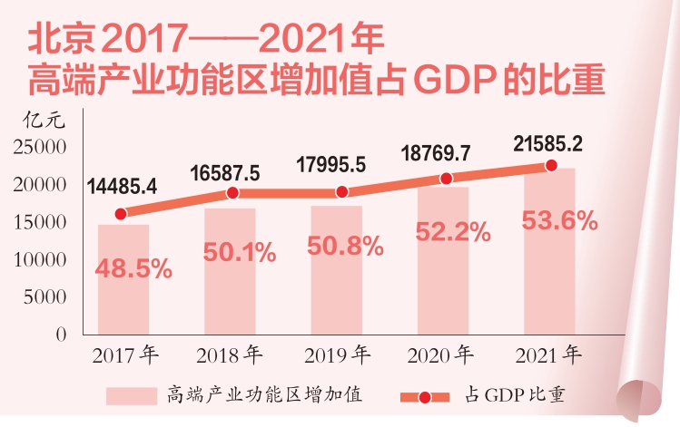 重點(diǎn)功能區(qū)呈現(xiàn)集聚效應(yīng)。中關(guān)村國(guó)家自主創(chuàng)新示范區(qū)等高端產(chǎn)業(yè)功能區(qū)占據(jù)全市經(jīng)濟(jì)總量的半壁江山,2021年實(shí)現(xiàn)增加值2.2萬億元,占全市GDP的53.6%,比2016年提高5.3個(gè)百分點(diǎn)。