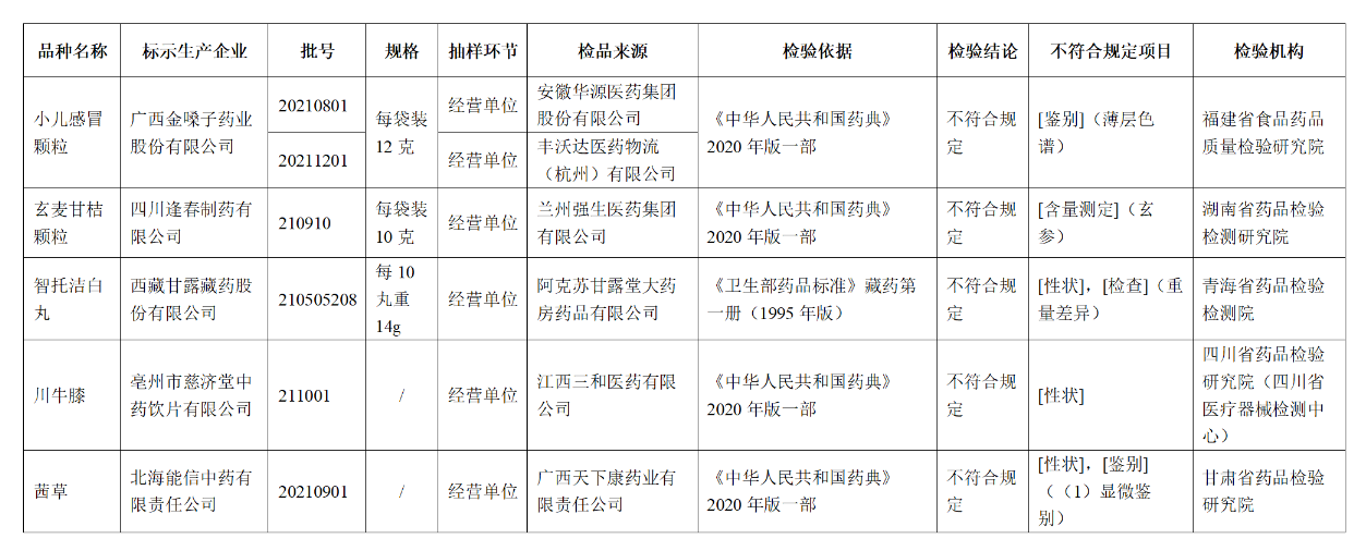 這些藥品包括:標(biāo)示為廣西金嗓子藥業(yè)股份有限公司生產(chǎn)的2批次小兒感冒顆粒不符合規(guī)定,不符合規(guī)定項(xiàng)目為鑒別;標(biāo)示為福元藥業(yè)有限公司生產(chǎn)的1批次阿達(dá)帕林凝膠不符合規(guī)定,不符合規(guī)定項(xiàng)目為pH值;標(biāo)示為榮康集團(tuán)廣西康世緣制藥有限公司生產(chǎn)的1批次川貝止咳糖漿不符合規(guī)定,不符合規(guī)定項(xiàng)目為裝量等。