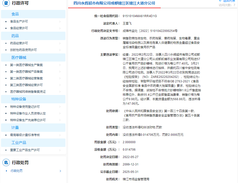 處罰決定文書顯示,經(jīng)查,2022年2月22日,當事人四川永輝超市有限公司成都錦江區(qū)錦江大道分公司從成都凱博農業(yè)發(fā)展有限公司購進57公斤食用農產(chǎn)品砂糖桔,購進價格為每公斤7.40元。當事人銷售的砂糖桔經(jīng)抽樣檢驗,苯醚甲環(huán)唑項目不符合GB 2763-2021《食品安全國家標準 食品中農藥最大殘留限量》要求,檢驗結論為不合格。據(jù)調查,該抽檢不合格批次砂糖桔除1.6公斤售賣抽樣單位外,剩余55.4公斤已全部售賣消費者,銷售價格為每公斤9.98元。經(jīng)計算,本案貨值金額為568.86元,違法所得為147.06元。