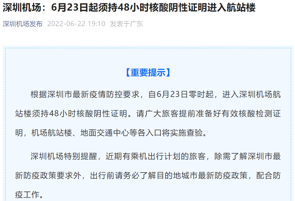 央廣網(wǎng)北京6月23日消息 據(jù)“深圳機場發(fā)布”微信公眾號消息,根據(jù)深圳市最新疫情防控要求,自6月23日零時起,進(jìn)入深圳機場航站樓須持48小時核酸陰性證明。請廣大旅客提前準(zhǔn)備好有效核酸檢測證明,機場航站樓、地面交通中心等各入口將實施查驗。