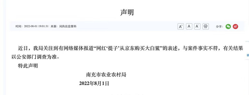 事件被越來越多人關(guān)注,公安部門已經(jīng)介入。平臺(tái)地址顯示“提子”位于四川南充,當(dāng)?shù)剞r(nóng)業(yè)農(nóng)村局的工作人員2日下午向記者證實(shí),已將涉事鯊魚送往鑒定機(jī)構(gòu)。“我們之前執(zhí)法監(jiān)督科送檢了一部分,這個(gè)案件現(xiàn)在是刑事案件,公安機(jī)關(guān)在這邊處理。”