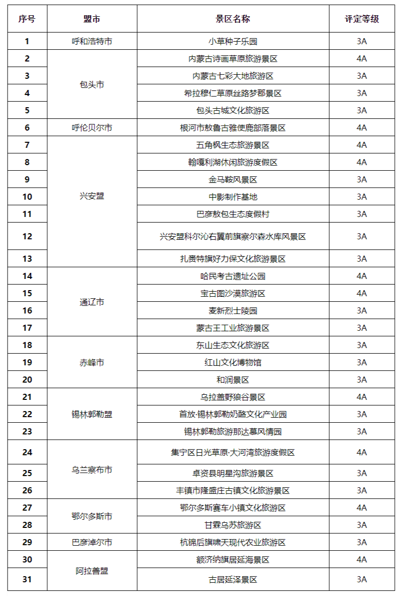 內(nèi)蒙古2022年擬確定國家4A級(jí)和3A級(jí)旅游景區(qū)共31家