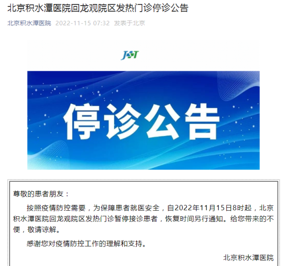 據(jù)北京積水潭醫(yī)院微信公眾號消息,按照疫情防控需要,為保障患者就醫(yī)安全,自2022年11月15日8時起,北京積水潭醫(yī)院回龍觀院區(qū)發(fā)熱門診暫停接診患者,恢復(fù)時間另行通知。給您帶來的不便,敬請諒解。