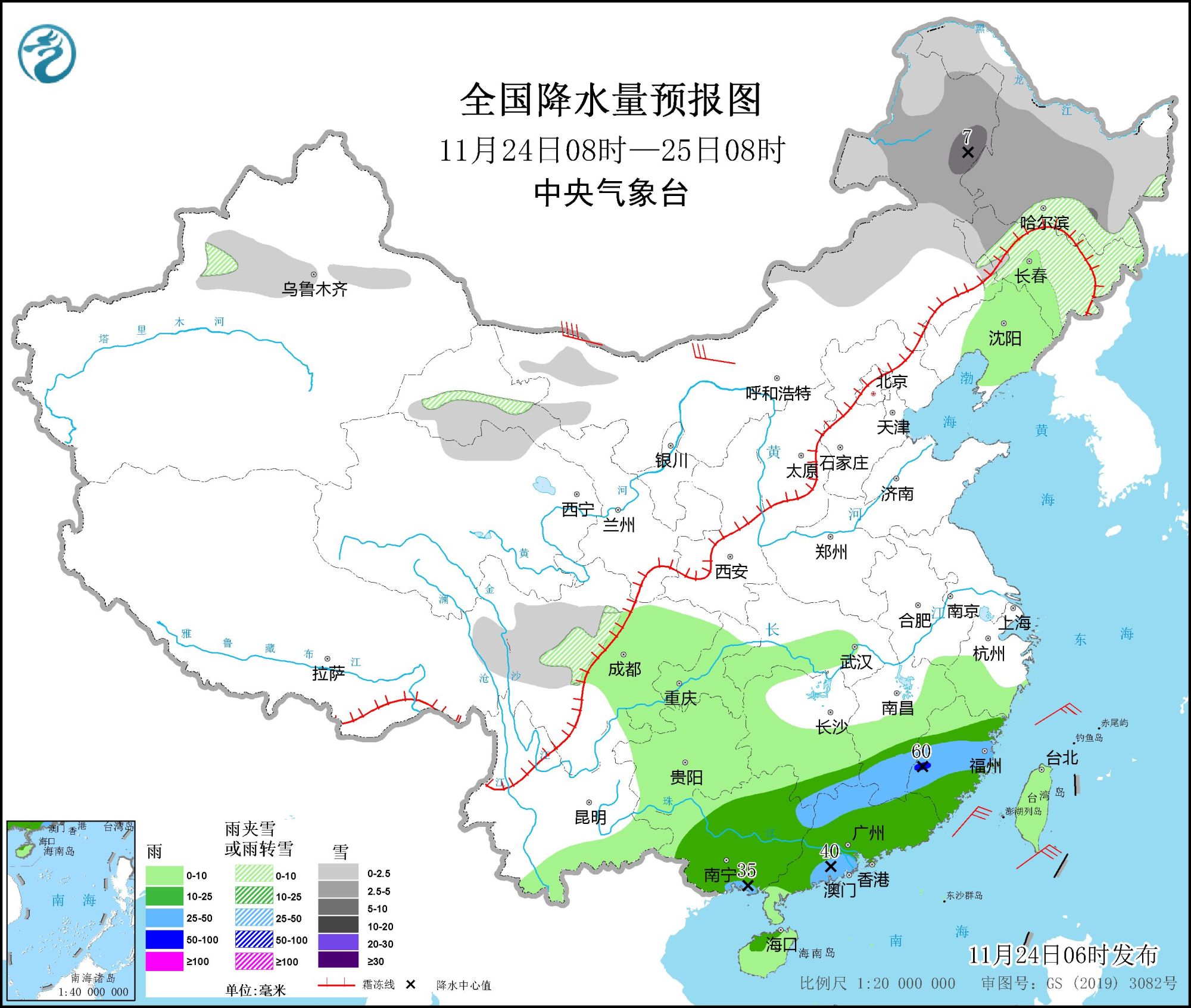 央廣網(wǎng)北京11月24日消息(記者黃玉玲)記者從中央氣象臺獲悉,未來三天,全國降水將呈現(xiàn)三足鼎立的局勢,新疆北部仍有較強(qiáng)降雪,華南地區(qū)雨水不歇,東北地區(qū)降雪來襲。