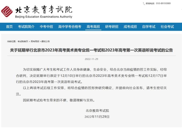 中新網(wǎng)11月29日電 據(jù)北京教育考試院網(wǎng)站消息,北京教育考試院29日發(fā)布公告,為切實(shí)保障廣大考生和考試工作人員身體健康、生命安全,結(jié)合北京當(dāng)前疫情防控工作實(shí)際,經(jīng)綜合研判,決定延期舉行原定于12月10日舉行的北京市2023年高考美術(shù)類專業(yè)統(tǒng)一考試和12月17日舉行的北京市2023年高考第一次英語聽說考試。