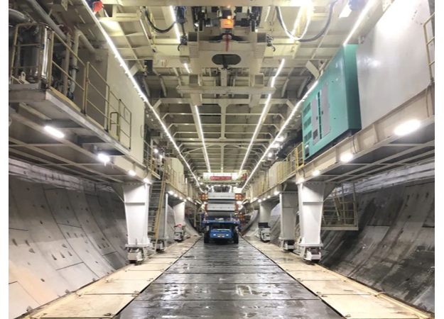 珠海興業(yè)快線隧道工程現(xiàn)場,一臺重4500噸、超5層樓高的“地下航母”正奮勇掘進,管片一片一片拼裝,隧道隨之一米一米建成。這臺“地下航母”,就是由中交天和自主研制的中國首臺超大直徑同步掘進機“興業(yè)號”,這也是國內(nèi)首次采用的同步掘進設(shè)計。常規(guī)隧道掘進機拼裝管片,一環(huán)管片寬2米,刀頭油缸推動,而油缸推動距離僅為2米多。因而,掘進2米后必須停止,掘進一環(huán)耗時近60分鐘,拼裝管片一環(huán)耗時近45分鐘?!芭d業(yè)號”的關(guān)鍵在于同步掘進,它改變了傳統(tǒng)油缸設(shè)計,推動距離可延長至4米,刀頭可實現(xiàn)持續(xù)掘進,后方同時拼裝管片,施工速度較國內(nèi)外同類掘進機提升25-35%,對超大直徑盾構(gòu)機發(fā)展具有一定劃時代意義。