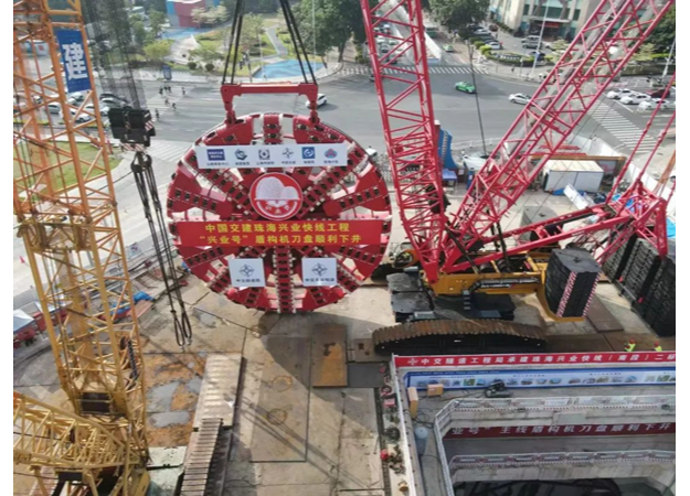 珠海興業(yè)快線隧道工程是未來連通港珠澳大橋和深中通道,把珠海市打造成為“粵港澳交通樞紐”的重要工程。盾構(gòu)隧道長度僅1740米,但地質(zhì)情況極為復(fù)雜,其中:硬巖段占比超過70%,被稱“地質(zhì)博物館”,且為首個國內(nèi)直徑最大雙層疊落盾構(gòu)工程,雙層疊落長約604米,盾構(gòu)法施工面臨不少世界級難題。為順利完成這項重大工程,中交天和立足自主研發(fā),著眼科技創(chuàng)新,為適應(yīng)在硬巖地質(zhì)中提高掘進速度,實現(xiàn)隧道掘進和管片拼裝同步施工,成功研制中國首臺超大直徑同步掘進機“興業(yè)號”。該掘進機國產(chǎn)化率達98%以上、刀盤直徑15.76米,全長超130米,攻克了許多難以想象的世界級難題。