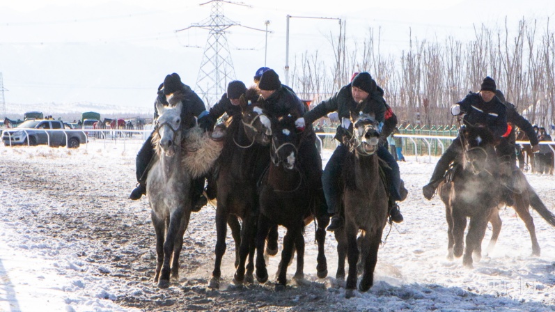 賽馬、斗雞、拔河、叼羊……賽場上選手激情澎湃,賽場下觀眾喝彩不斷。一匹匹風馳電掣的駿馬激起雪霧陣陣,騎手們用精湛的馬技點燃寒冬里的激情,一場精彩紛呈的冰雪盛宴正式上演。