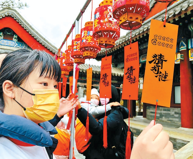 玉淵潭公園昨天(5日)開展了“正月十五花燈俏 科普猜謎送福瑞”傳統(tǒng)文化主題活動?;顒蝇F(xiàn)場,燈謎與燈籠競相爭輝,一只只小燈籠高高掛起,一條條五彩斑斕的燈謎似條條彩帶隨風飄揚。謎面內(nèi)容豐富有趣,現(xiàn)場參與猜燈謎環(huán)節(jié)的游客朋友們或仰頭讀題,或低頭沉思,你一言我一語,一個個有趣的謎底在大家的思索中紛紛揭曉。