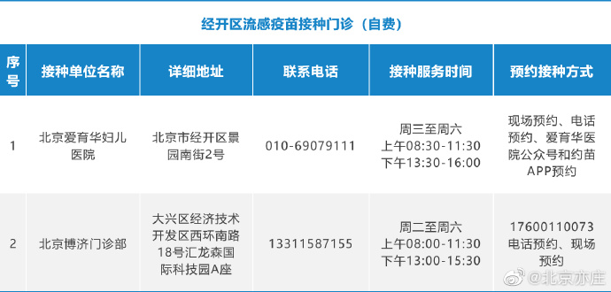社會事業(yè)局相關(guān)負(fù)責(zé)人介紹,經(jīng)開區(qū)將繼續(xù)采用提前預(yù)約方式開展自費(fèi)流感疫苗接種工作。目前,經(jīng)開區(qū)共設(shè)立北京博濟(jì)門診部、北京愛育華婦兒醫(yī)院兩個流感疫苗接種服務(wù)點(diǎn),有接種需求的市民可提前向接種門診預(yù)約咨詢,可通過電話、現(xiàn)場登記、微信公眾號及其他網(wǎng)絡(luò)預(yù)約方式完成預(yù)約。