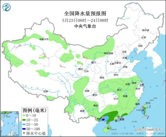 5月22日08時(shí)至23日08時(shí),江南中南部、華南大部、臺(tái)灣島大部等地部分地區(qū)有中到大雨,其中,廣東中南部、臺(tái)灣島北部等地部分地區(qū)有暴雨(50~70毫米)。新疆南疆盆地和東部、江西中部、廣西東北部等地部分地區(qū)有4~6級(jí)風(fēng)。東海大部海域、臺(tái)灣海峽、臺(tái)灣以東洋面將有6~7級(jí)、陣風(fēng)8~9級(jí)的風(fēng)。