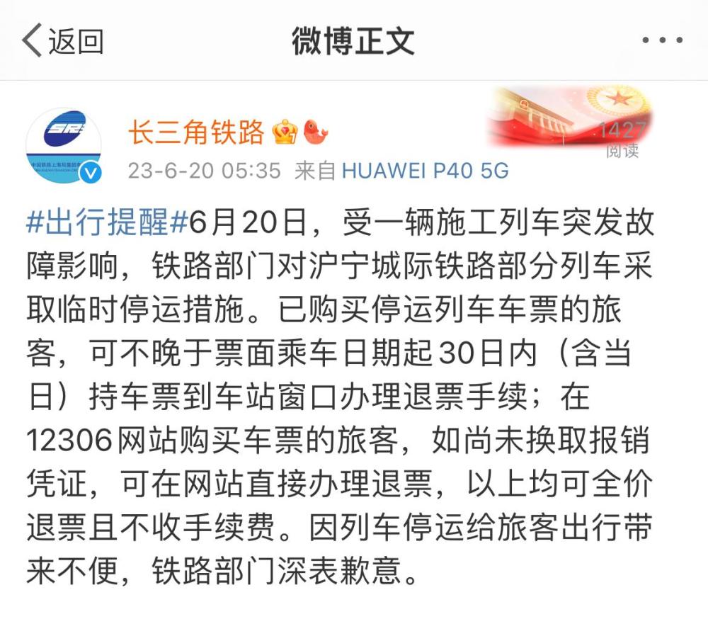 記者6月20日從鐵路上海局獲悉,受一輛施工列車突發(fā)故障影響,鐵路部門對滬寧城際鐵路部分列車采取臨時停運(yùn)措施。已購買停運(yùn)列車車票的旅客,可不晚于票面乘車日期起30日內(nèi)(含當(dāng)日)持車票到車站窗口辦理退票手續(xù);在12306網(wǎng)站購買車票的旅客,如尚未換取報銷憑證,可在網(wǎng)站直接辦理退票,以上均可全價退票且不收手續(xù)費(fèi)。