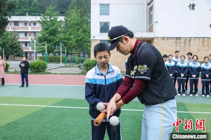 今年4月,臺(tái)青宋奇軒在北京合伙創(chuàng)辦“新世代棒球俱樂部”。圖為宋奇軒在四川省青川縣為當(dāng)?shù)貙W(xué)校開展公益棒球課項(xiàng)目。(受訪者供圖)
