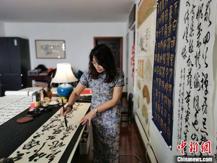 近日,楊玉如在書齋中練習(xí)書法?!≈行律缬浾?鐘升 攝