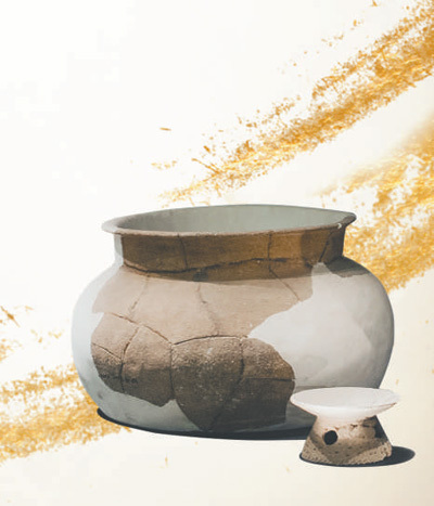 三星堆第三發(fā)掘區(qū)出土的陶高領甕(后)和陶鏤孔圈足盤。圖為三星堆博物館提供