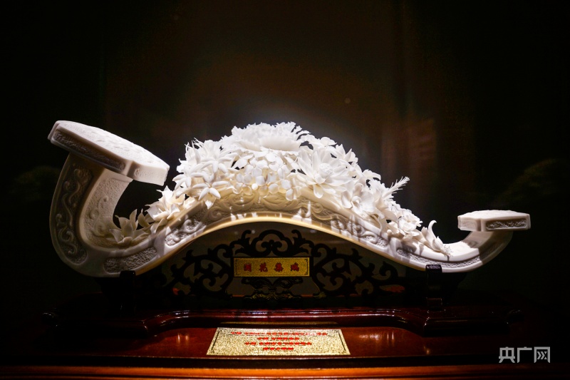 展出的德化白瓷作品《國花集瑞》(央廣網(wǎng)見習(xí)記者 李?yuàn)檴?攝)