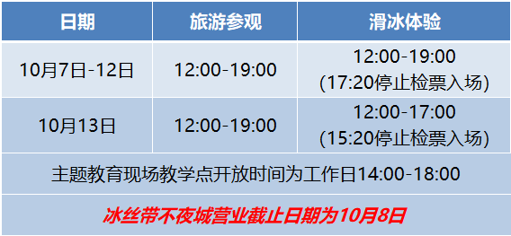 10月7日至10月12日,旅游參觀和滑冰體驗(yàn)開放時(shí)間為12:00-19:00,滑冰體驗(yàn)停止檢票入場時(shí)間為17:20。