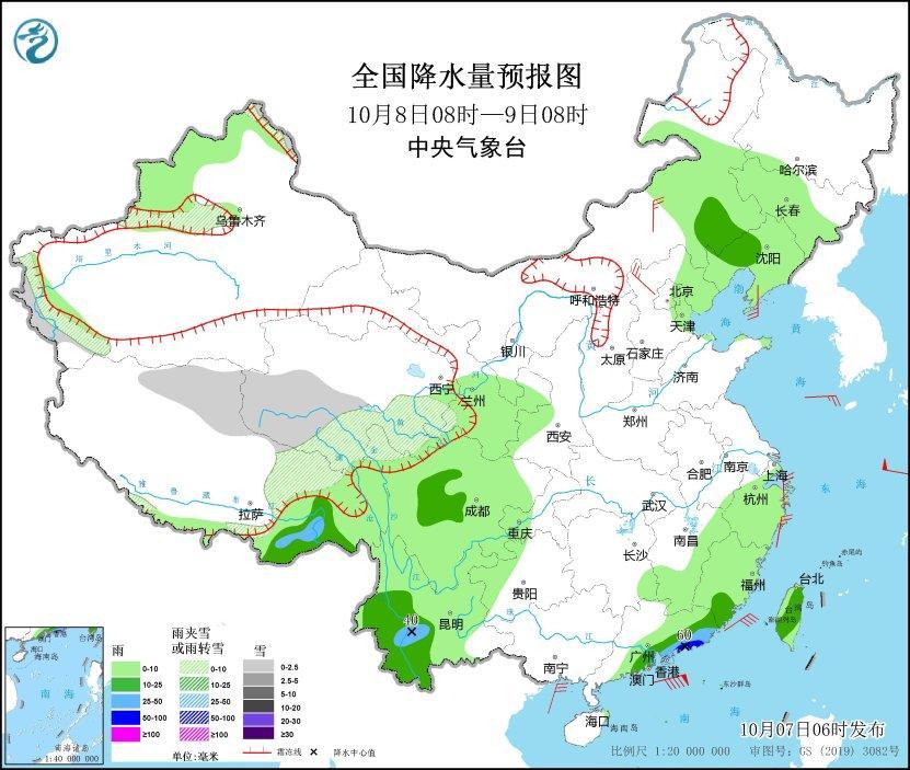 10月7日08時(shí)至8日08時(shí),內(nèi)蒙古中部、西藏東南部、江南東部和南部、西南地區(qū)南部、華南北部和南部、臺(tái)灣島大部等地部分地區(qū)有中到大雨,其中,福建東南部、廣東東南部等地部分地區(qū)有暴雨(50~60毫米)。內(nèi)蒙古中部、遼東半島、浙江北部、廣東中部等地部分地區(qū)有4~6級(jí)風(fēng)(見圖1)。