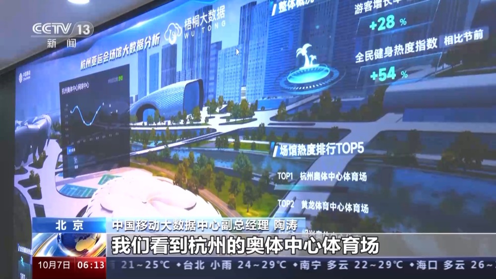 中國(guó)移動(dòng)大數(shù)據(jù)中心副總經(jīng)理 陶濤:前往亞運(yùn)會(huì)主要舉辦城市的游客的數(shù)量相比節(jié)前一周日均增幅超過28%,主要是來自長(zhǎng)三角地區(qū)以及津京冀等地區(qū)。根據(jù)我們對(duì)于線上訂票以及搜索這些數(shù)據(jù)的分析,我們看到杭州的奧體中心體育場(chǎng)、黃龍?bào)w育中心體育場(chǎng)以及紹興奧體中心體育館這三個(gè)場(chǎng)館是最熱的體育場(chǎng)館。