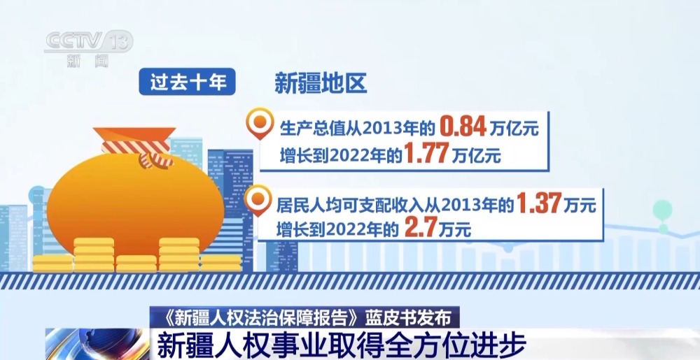 會(huì)議期間,還舉行了《新疆人權(quán)法治保障報(bào)告》藍(lán)皮書揭幕儀式。過去十年,新疆地區(qū)生產(chǎn)總值從2013年的0.84萬億元增長(zhǎng)到2022年的1.77萬億元,居民人均可支配收入從2013年的1.37萬元增長(zhǎng)到2022年的2.7萬元。