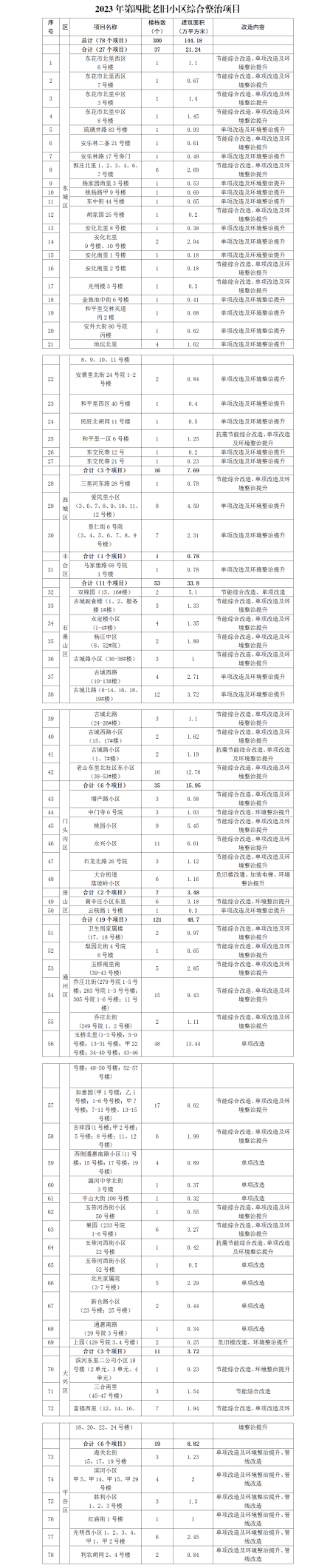 央廣網(wǎng)北京12月22日消息(記者門庭婷)12月22日,北京市住房城鄉(xiāng)建設(shè)委公布了2023年第四批老舊小區(qū)綜合整治項(xiàng)目名單,共有78個(gè)項(xiàng)目納入改造計(jì)劃,涉及改造樓棟數(shù)300棟,2萬戶,改造建筑面積144萬平方米。