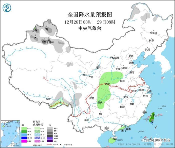 12月28日08時(shí)至29日08時(shí),內(nèi)蒙古東北部、黑龍江西北部、新疆北部、西藏東部等地部分地區(qū)有小雪或雨夾雪,其中,新疆北疆北部和沿天山地區(qū)等地部分地區(qū)有中到大雪(5~8毫米)。西北地區(qū)東部、華北南部、黃淮西部、西南地區(qū)東部、臺(tái)灣島等地部分地區(qū)有小到中雨,其中,臺(tái)灣島等地部分地區(qū)有大雨(25~40毫米)。青海西部部分地區(qū)有5~6級(jí)風(fēng)(見(jiàn)圖3)。