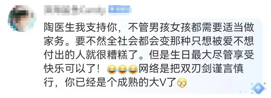 一部分網(wǎng)友認為表達了對陶勇醫(yī)生的支持:“不管男孩女孩都需要適當做家務(wù)”“玉不琢不成器”。