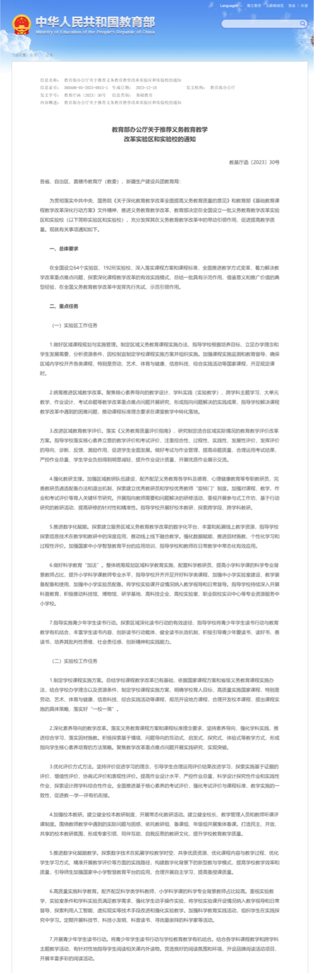 在此,教育部新聞辦提醒廣大網(wǎng)友,《教育部辦公廳關(guān)于推薦義務(wù)教育教學改革實驗區(qū)和實驗校的通知》明確了義務(wù)教育教學改革實驗區(qū)和實驗校的工作任務(wù),其中并無縮短學制、取消中考等內(nèi)容,不要輕易采信非官方渠道的信息。