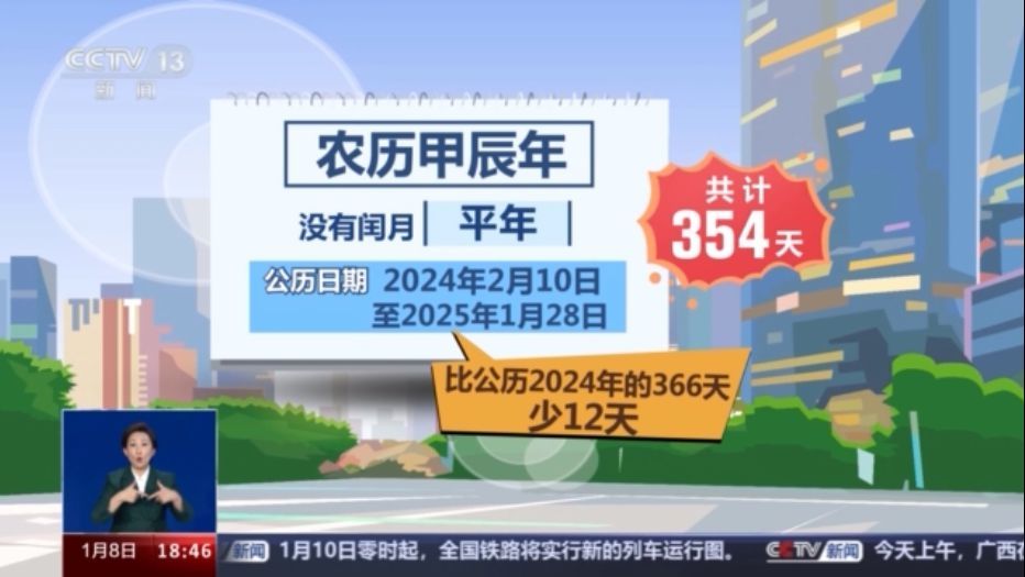 即將到來的農(nóng)歷甲辰年沒有閏月,因此是一個(gè)平年,其對(duì)應(yīng)的公歷日期為2024年2月10日至2025年1月28日,共計(jì)354天。所以比公歷2024年的366天少了12天。