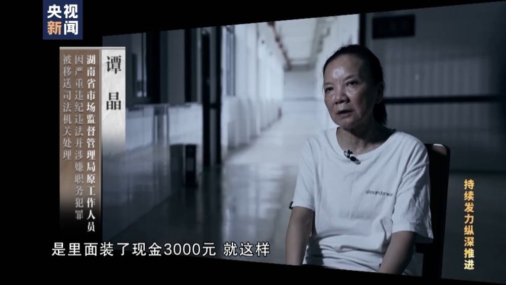 湖南省市場監(jiān)督管理局原工作人員 譚晶:他就拿了一個信封,在沒人的地方他就悄悄塞給我,他說是我們單位的資料。然后我回去以后發(fā)現(xiàn)是里面裝了現(xiàn)金3000元,就這樣。所以我不逃避我自己的(責(zé)任),犯了法要承擔(dān)法律的責(zé)任,一定要。