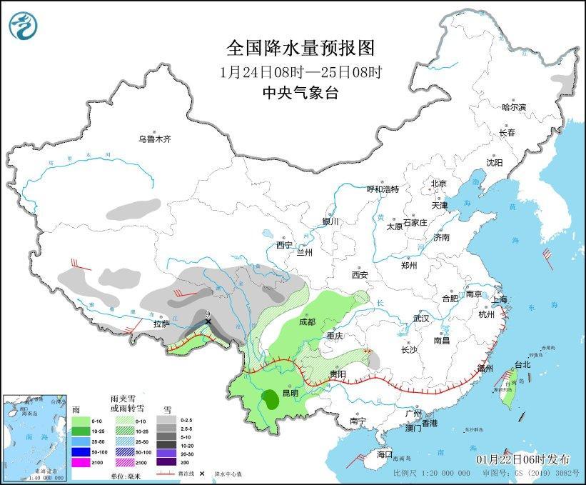 1月24日08時(shí)至25日08時(shí),黑龍江東北部、新疆南疆盆地、西藏北部和東部、青海南部、川西高原、云南西北部、貴州西部和中部、湖南西部等地部分地區(qū)有小雪或雨夾雪,其中,西藏東南部、川西高原北部等地局地有中到大雪(5~9毫米),湖南西部、貴州中部、云南東部等地局地有凍雨。西藏南部、四川盆地中東部、云南大部、臺(tái)灣島等地部分地區(qū)有小雨,局地中雨。黃海、東海、臺(tái)灣海峽、臺(tái)灣以東洋面、巴士海峽、南海大部、北部灣等海域有6~7級(jí)風(fēng),陣風(fēng)8~9級(jí)(見(jiàn)圖5)。